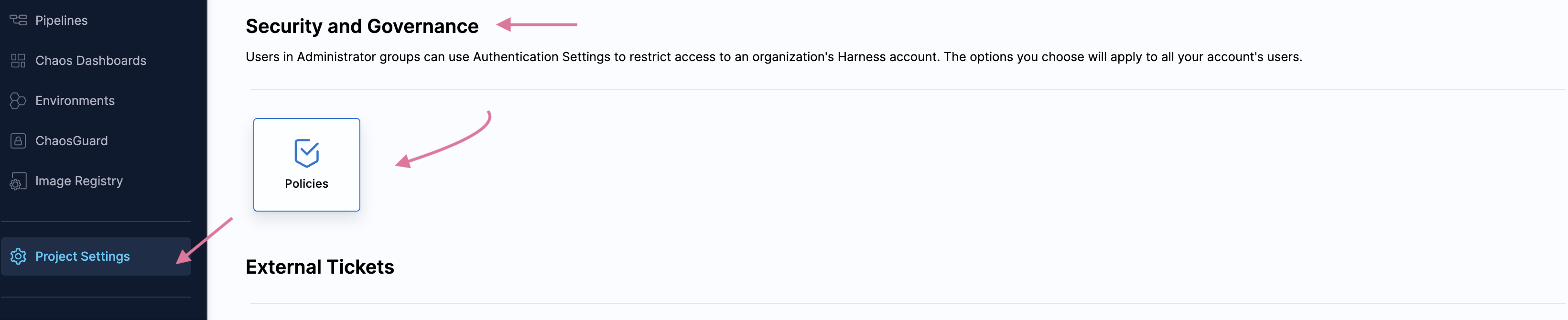 To apply an OPA policy to your pipeline, go to Chaos module -> Project Settings. Under Security and Governance, select Policies.