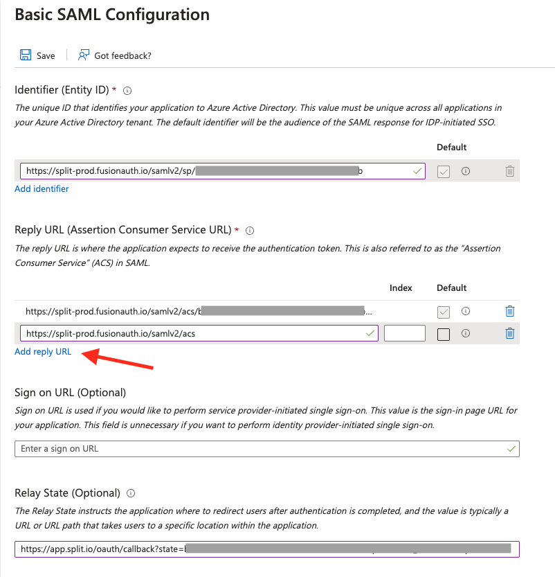 1. Navigate back to Azure and use the value for Assertion Consumer Service URL, provided in Split in the configuration parameters, into the Basic SAML Configuration box for Reply URL.